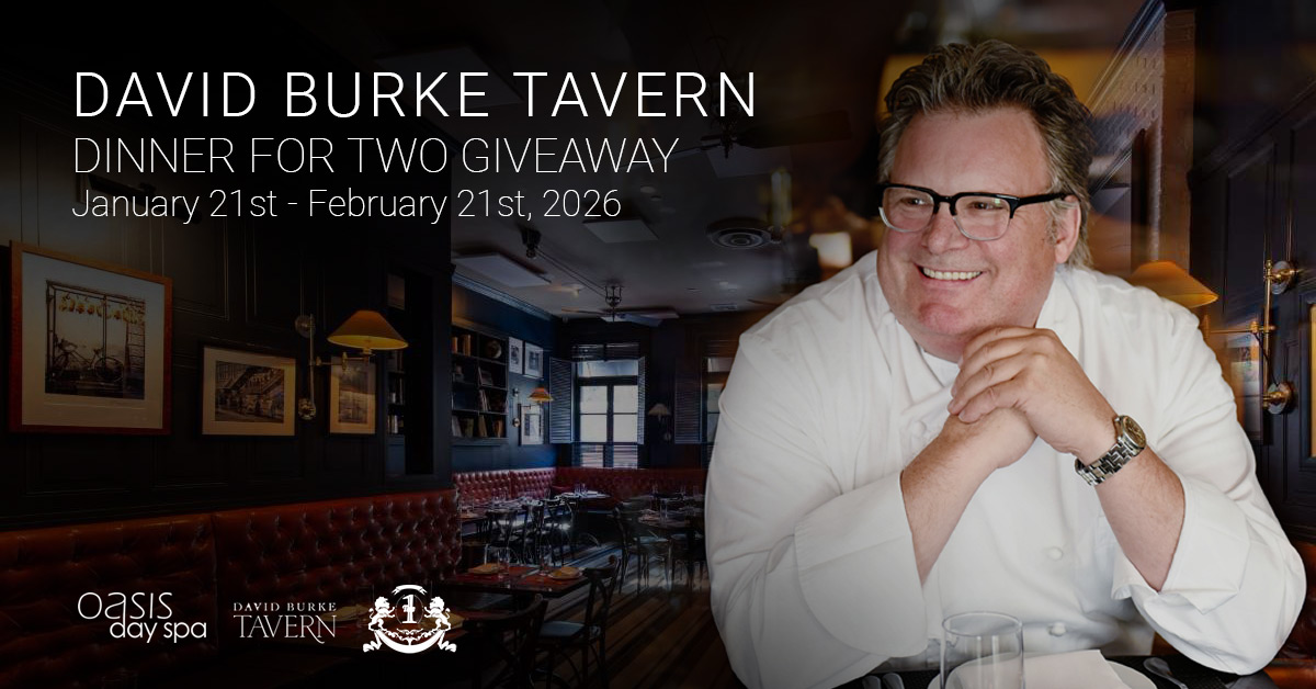 Just in time for Valentine’s Day, Oasis Day Spa is giving away a chance to meet celebrity chef David Burke, a dinner for 2, along with a bottle of wine from The 1 Wine, at David Burke Tavern in NYC.