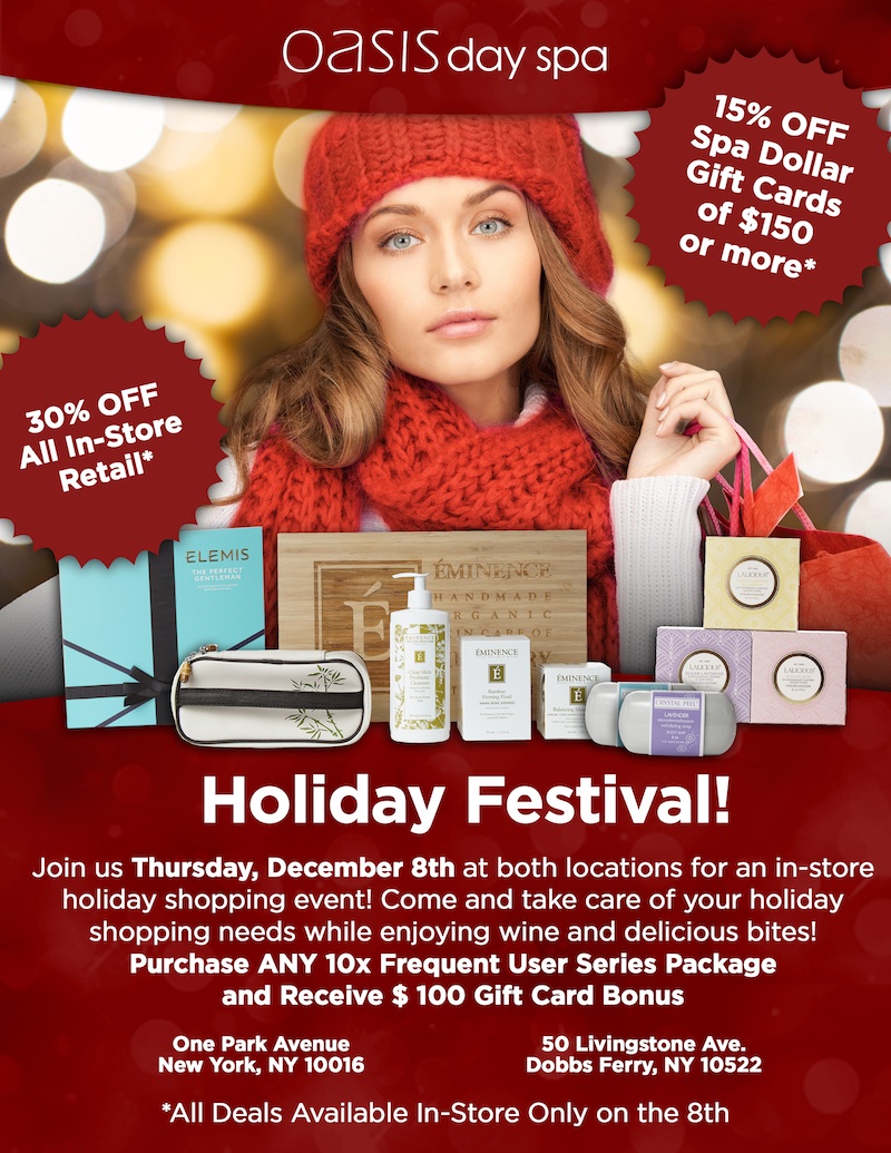 December 8th – at Oasis locations in New York City and Westchester – The most relaxing Holiday Shopping you’ll do all season. 30% OFF All Spa Retail Products, 15% OFF Spa Dollar Gift Cards over $150 and more.
